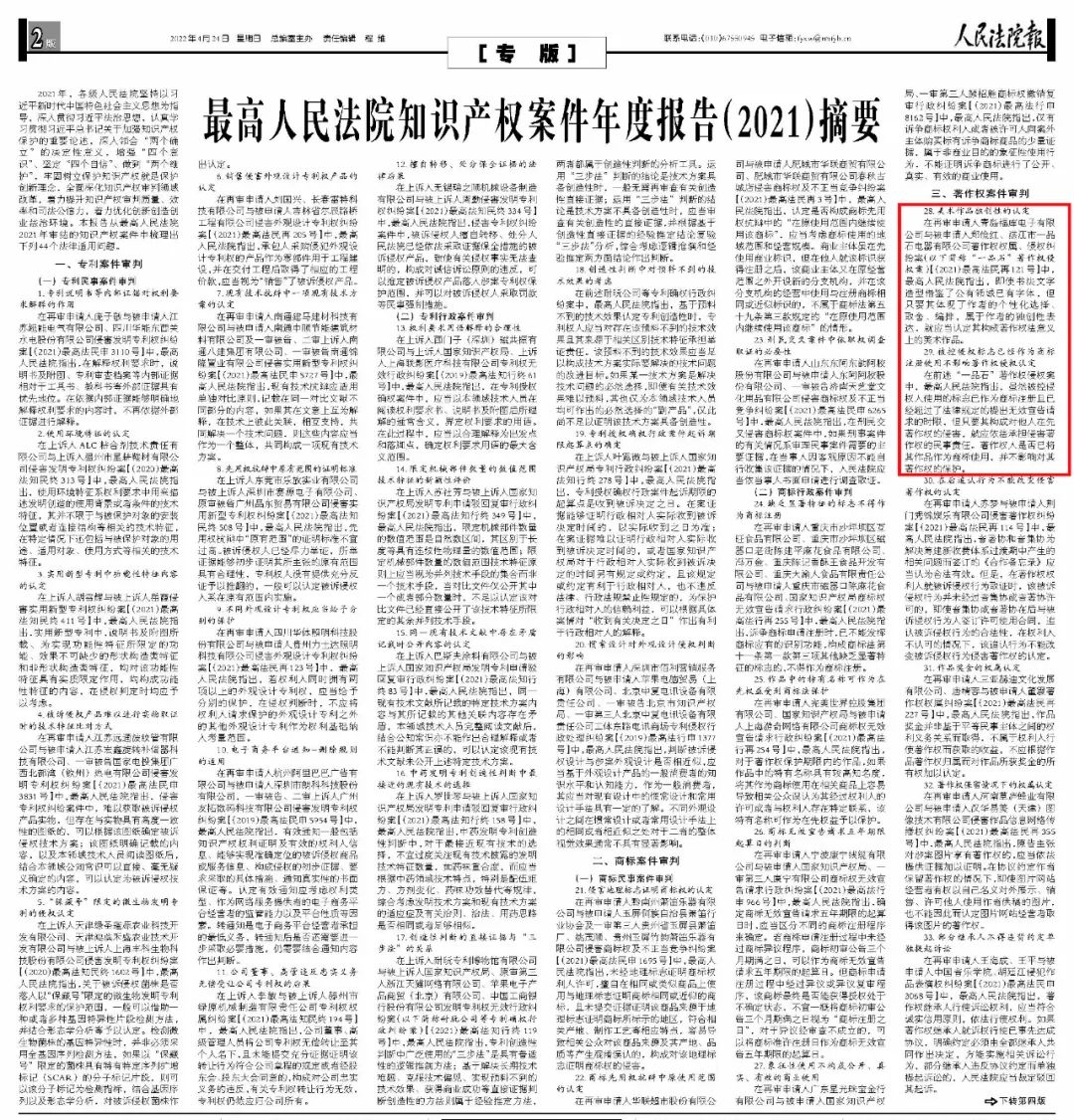 近期,最高人民法院发布《最高人民法院知识产权案件年度报告(2021)摘要》,从最高院2021年审结的知识产权案件中梳理出44个法律适用问题,供社会各界研究和参考,以期进一步传播知识产权法治理念,营造有利于知识产权高质量发展的法治氛围。集佳代理的“一品石”著作权侵权纠纷案作为著作权典型案件入选该报告。
