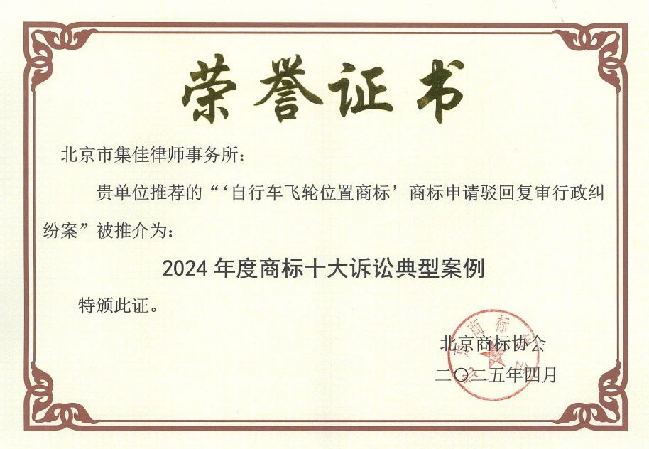 >必赢>关于我们>荣誉概览>2025>集佳代理“自行车飞轮位置商标”行政纠纷案入选北京商标协会年度十大诉讼典型案例