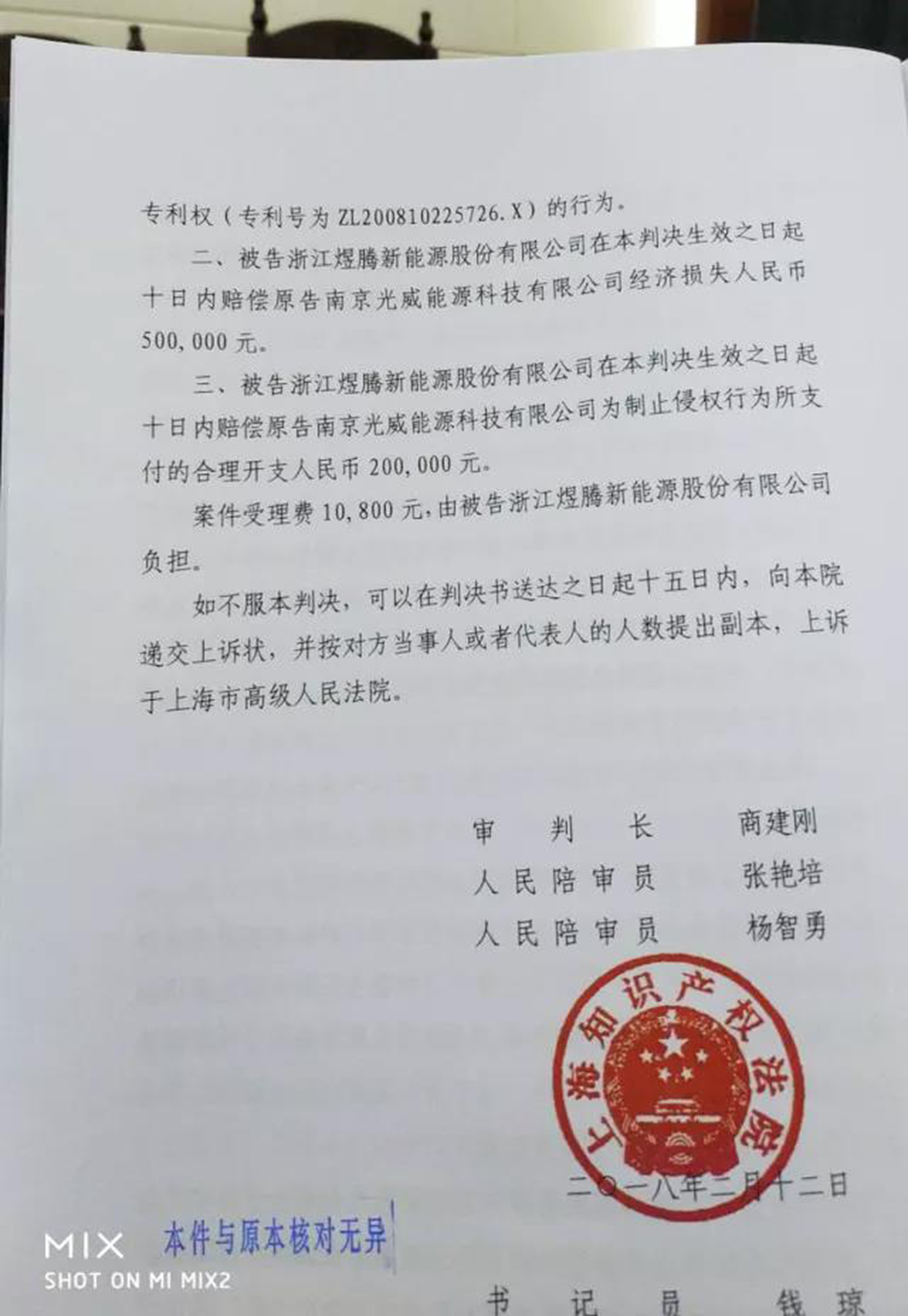 集佳代理南京光威能源科技有限公司(以下简称“光威公司”)诉浙江煜腾新能源股份有限公司(以下简称“煜腾公司”)侵害发明专利权纠纷一案,经上海知识产权法院一审查明事实后,于2018年2月12日宣判:被告煜腾公司制造、销售、许诺销售的被控“板式太阳能集热器产品”落入涉案专利权的保护范围,被告在判决生效之日起停止侵害涉案发明专利权的行为,并全额支持了原告主张的侵权损害赔偿及合理开支。