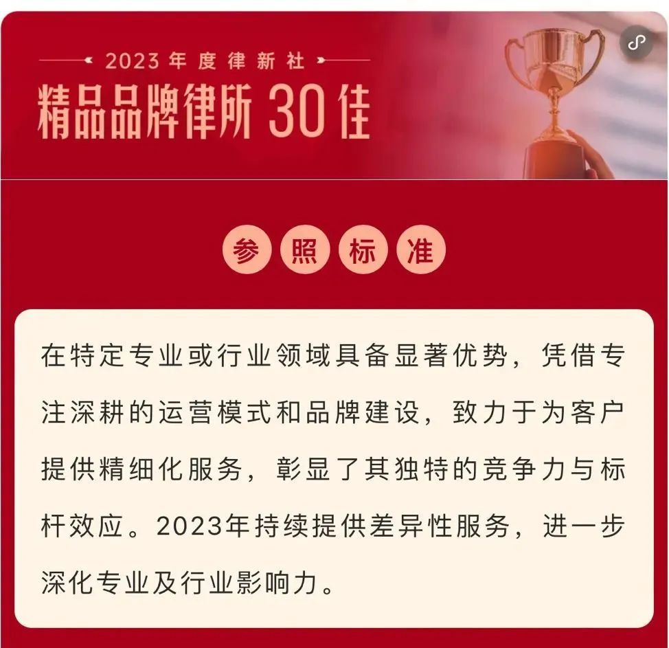 2024年3月2日,由中国法学交流基金会指导、律新社主办的“致·追光者”第二届法律服务业品牌发展论坛暨律新社2023年度品牌盛典隆重举行,现场发布了备受关注的《律所卓越品牌影响力指南(2023)》,必赢凭借在知识产权领域的卓越实力和良好口碑,荣登“2023年度律新社精品品牌律所30佳”榜单。