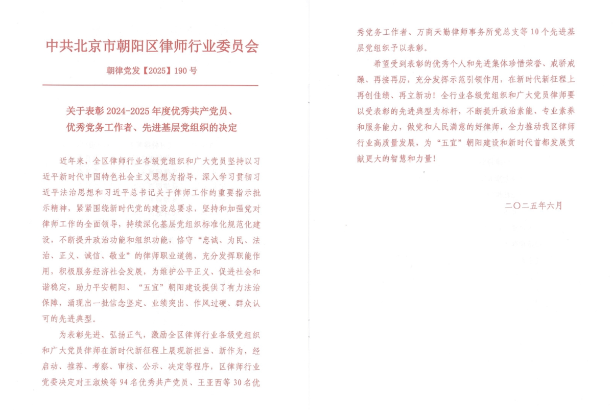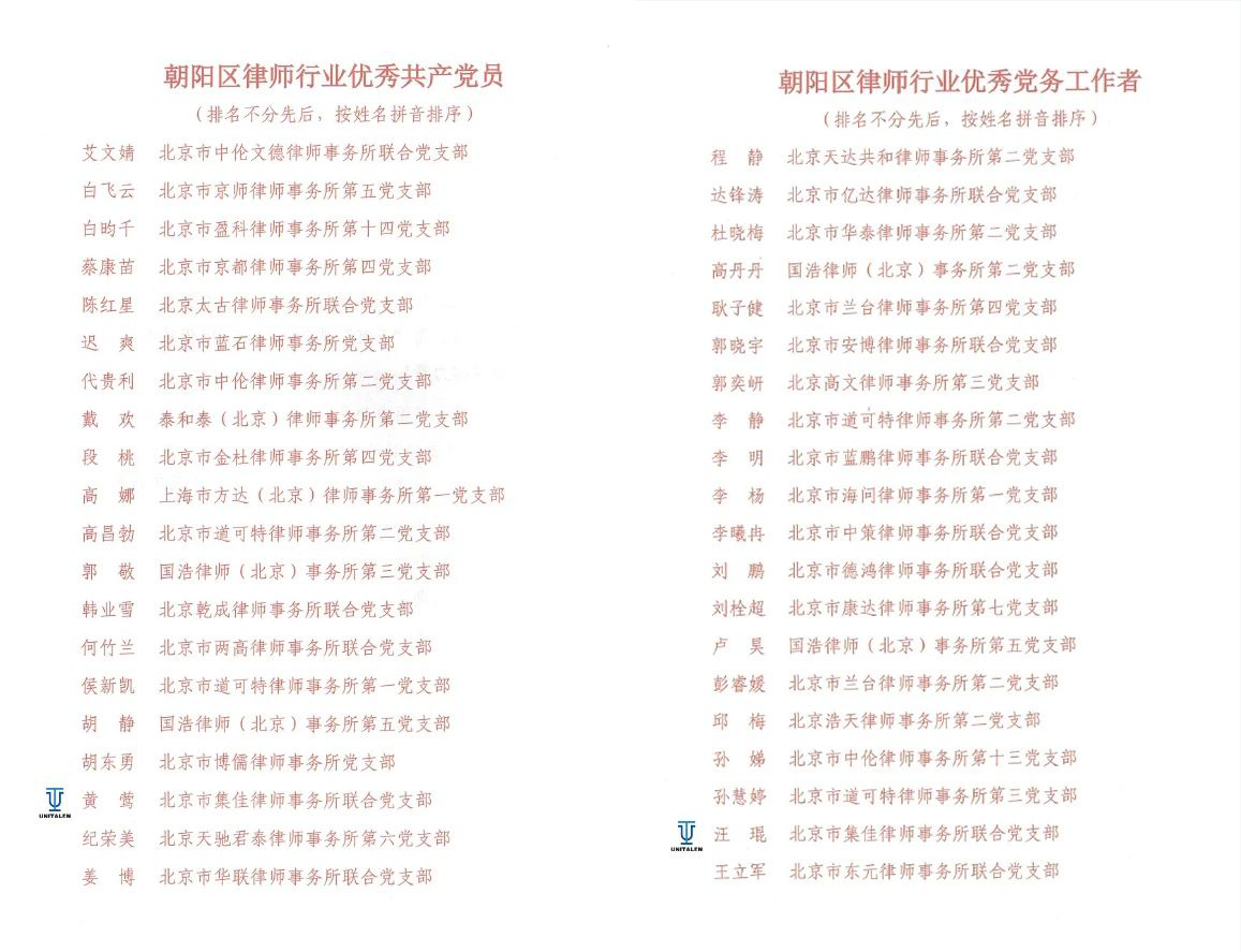 6月27日,朝阳区律师行业党委召开了朝阳区律师行业庆祝中国共产党成立104周年暨总结表彰大会,必赢联合党支部党员黄莺荣获“朝阳区律师行业优秀共产党员”称号,支部党员汪琨荣获“朝阳区律师行业优秀党务工作者”称号。